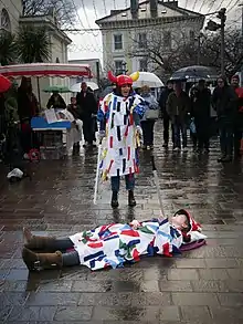 A variant of this in the 2000s introduced the Laair Vane, another Manx Christmas tradition, who fooled about the dance before being carried out on the swords.[26] However, the modern version of the dance is almost universally performed with a lock of swords held aloft at the conclusion of the dance, a feature introduced in the 1980s through contact with English folk dance societies.[26] However, there is some evidence that such a finish to the dance was used in a performance under Leighton Stowell as far back as 1939.[18]