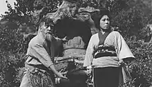 The film was praised for its happy ending even though the Aoki's character lost her village.[23] Critic Gina Marchetti proposed in her book Tragic and Transcendent Love in the Forbidden City that the film was "simultaneously warning against miscegenation while celebrating romantic love."[24] The lead actress Tsuru Aoki's acting was also highly appreciated for adding "the sense of naturalness to the archetypal narrative between Japan and the United States."[7] However, in Japan the lead actors Hayakawa and Aoki were considered insults to the country. The Japanese film critics labeled the film "Anti-Japanese" for portraying the country and its people in a primitive manner. The film premiered in Asakusa's Fujikan Theater on September 15, 1918 but was banned a few weeks later for bringing "dishonour to the country".[25][26][27]