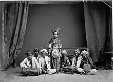 Wayang wong, also known as wayang orang (literally "human wayang"), is a type of classical Javanese dance theatrical performance with themes taken from episodes of the Ramayana or Mahabharata. The bas relief panels on the 9th-century of Prambanan temple show episodes of the Ramayana epic. The adaptation of Mahabharata episodes has been integrated in the Javanese literature tradition since the Kahuripan and Kediri era, with notable examples such as Arjunawiwaha, composed by Mpu Kanwa in the 11th century. The Penataran temple in East Java depicts themes from the Ramayana and Mahabharata in its bas reliefs. The Javanese dance drama associated with wayang's epic themes from the Ramayana and Mahabharata would have existed by then. Wayang wang was a performance in the style of wayang kulit (the shadow theatre of Central Java) wherein actors and actresses took the puppets' roles. The first written reference to the form is on the stone inscription Wimalarama from East Java dated 930 CE. The genre is currently done in masked and unmasked variations in Central Java, Bali, and Cirebon, as well as in Sundanese (West Java). Wayang wong is closely associated with Indonesian culture.[4]