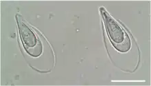 | Fresh myxospores of T. kitauei from a skin smear of common carp; from Zhai et al. 2016; size bar 10 μm. | |