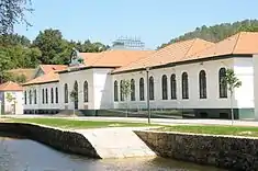 The main buildings of the thermal spa park: the changing areas, main pavilion and utilities buildings, crossed by the Ribeira da Folia