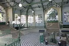 The interior is plastered and painted blue, encircled granite base and sections defined by pilasters where iron structures that support that roof are affixed, lined with wooden lathes painted in blue.[1] The main doorways are in the east, north and west preceded by three ample stairs with iron guardrail and ceramic flooring. In the centre of the building is the primitive buvette thermal spring recessed into an octagonal plan with similar pavement, and protected by iron grate, painted green (with faceted basins on angles).[1] The fountain is protected by a cylindrical bell-shaped structure. Around the building is a raised wing, accessed by an intermediary landing of stairs, with black and white ceramic floors and iron guard painted green, decorated by stylized voluptuous motifs.[1] These structures also integrate lamps on their angles into the high columns, with globe of lighting surrounded by several stylized arms (the globe lighting repeated from the ceiling).[1] A gutter runs along the lowest part of the interior with drains in the corners.[1] A centralized apparatus opens the six central rotary panels; by using a vertical iron rod, moved by a lever, allows the windows to be opened simultaneously.[1] The rooftop is a grid of horizontal rods with bearings that run north to south supporting the weight of the structure.[1]