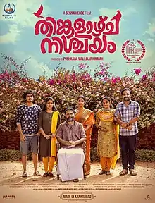 Thinkalazhcha Nishchayam is a 2021 Indian Malayalam-language, comedy-drama film written and directed by Senna Hegde.[1] The film won the Best Feature Film in Malayalam at the 68th National Film Awards.[2] It was also chosen as the Second Best Film and Senna Hegde received the award for Best Story at the 51st Kerala State Film Awards.[3] The film was also selected for the 25th International Film Festival of Kerala under the "Malayalam Cinema Today" category.[4] The film was produced by Pushkara Mallikarjunaiah under the banner of Pushkar Films.[5]