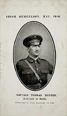 Following the Rising, Hunter was sentenced to death – this was later commuted to penal servitude for life.[31][32] In 1917 Hunter, along with Éamon de Valera and Thomas Ashe, was recognised by his fellow prisoners at Lewes prison as one of their Commanding Officers.[33] On 28 May of that year, de Valera, Ashe and Hunter lead a prison hunger-strike demanding to be treated as Prisoners of War and not regular criminals.[34] This led the British authorities to remove the prisoners from Lewes to separate facilities. On 5 June, Hunter was moved to Maidstone Prison with de Valera, albeit in a separate car.[35] By 18 June 1917, all participants of the Easter Rising had been released.