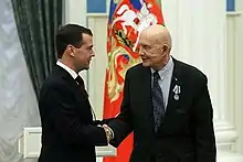 Stafford was presented with the Medal "For Merit in Space Exploration" from Russian President Dmitry Medvedev on April 12, 2011, at the Moscow Kremlin