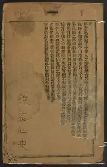 Tiehua xianshi (traditional Chinese: 鐵花仙史; simplified Chinese: 铁花仙史), also translated into English as A History of the Immortal and Iron Flower[1] or History of the Iron-Flower Immortals,[2] is a Chinese novel of the Qing dynasty. Its authorship is ascribed to Yunfeng Shanren (雲封山人), which is a pseudonym.[3] The novel consists of 26 chapters and was written in the Kangxi era (1662-1722). It is often categorized as a "caizi jiaren" romance novel, however, the novel also has various adventure elements that would be considered as part of "wuxia" (chivalry and martial-arts) and fantasy genres, and it is not simply just a love story.