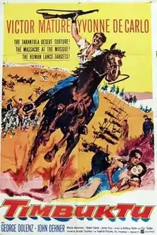 Timbuktu is a 1959 American black-and-white adventure film directed by Jacques Tourneur and starring Victor Mature and Yvonne De Carlo. It is set in Timbuktu (Africa), but was filmed in the Coral Pink Sand Dunes State Park in Kanab, Utah.[1]