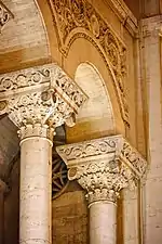 At the beginning of the 20th century nearby buildings included Lloyd Palace (built in 1912), Löffler Palace (1913), palaces on the nearby Corso[24] and, most notably, immediately to its right, the Palace of Băncile Bănățene Reunite (1933), a consortium of local Swabian banks.[25] All these buildings were taller than the theatre, which was the focus of the view down Ferdinand Boulevard, so it was felt necessary to update its façade. This was again entrusted to Duiliu Marcu, who raised the façade by placing a travertine-clad "triumphal arch" around the entrance and the balcony on the first floor.[7][26][27] In order to standardize the style of the façade, the windows on the sides of the arch were blocked up.[26] The reconstruction of the façade cost 2,660,023 lei.[27]
