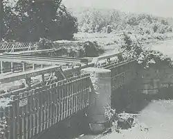 Tinkers Creek Aqueduct is an aqueduct that was constructed to bridge the Ohio and Erie Canal over Tinkers Creek near its confluence with the Cuyahoga River in Valley View, Ohio. It is a relatively rare surviving example of an Ohio and Erie Canal aqueduct. It was originally constructed in 1825-1827 by, and re-built due to flood damage in 1845 and 1905.[11] Tinkers Creek Aqueduct was included in a National Historic Landmark district established in 1966, and it was separately listed on the National Register of Historic Places in 1979.[12][13] The original Tinkers Creek Aqueduct was a wood plank, steel truss, and Ashlar-sandstone structure constructed in 1827, south of the present aqueduct's location. Cuyahoga River and Tinkers Creek flooding caused continual damage to the original aqueduct, so successive structures were built in 1845 and 1905 in the present location. Today, Tinkers Creek Aqueduct is the only aqueduct which remains of the four original aqueducts in the Cuyahoga Valley.[6] Of Furnace Run Aqueduct, Mill Creek Aqueduct, Peninsula Aqueduct, and (? Yellow Creek ?) Aqueduct; Mill Creek Aqueduct, of newer construction, is the only aqueduct which still carries Ohio and Erie Canal water. After 102 years of flooding, weathering, and deterioration, Tinkers Creek Aqueduct was removed in 2007. The National Park Service is currently working on Phase II of the project to reconstruct it from newer materials.[10]