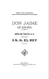 Though Olazábal's prestige with the claimant diminished, it was still at its height. When in 1894 Don Jaime, the 24-year-old son of the claimant, was agreed[140] to pay his first visit to Spain, it was Olazábal appointed his tutor and cicerone. The trip lasted 37 days[141] and covered a route from San Sebastián to Vitória, Burgos, Santander, Covadonga, Oviedo, León, Madrid, Aranjuez, Toledo, Córdoba, Jerez, Málaga, Sevilla, Granada, Jaen, Valencia, Barcelona and Montserrat.[142] The event turned into a media scoop, discussed for months, accompanied by anecdotes[143] and with Olazábal becoming sort of a celebrity. In 1895 he published a booklet with a hagiographical account of the trip.[144] Though the press was speculating about differences between Olazábal and his king,[145] he felt fit to explain to the journalists the meanders of dynastical policy of the claimant.[146]