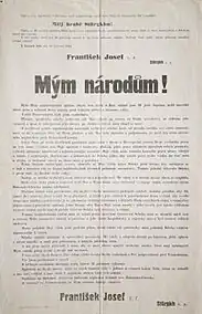 To my peoples! (German: An Meine Völker!, Hungarian: Népeimhez!, Czech: Mým národům!, Slovene: Mojim narodom!, Italian: Ai miei popoli!) was a manifesto signed by Emperor Franz Joseph I of Austria-Hungary in Bad Ischl on July 28, 1914. The text announced the Austro-Hungarian entry into World War I and the declaration of war on Serbia, starting World War I.