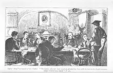 Tom's "Wine" in honour of his Father. "The Squire, who has been carefully planted by Tom with his back to the death warrant, enjoys himself very much."—P. 464. Frontispiece by Sydney Prior Hall from the 1885 Macmillan and Company edition of Tom Brown at Oxford