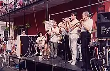 Jacques Gauthe Creole Rice Jazz Band, French Quarter Festival, New Orleans. Visible musicians: Tom Roberts, piano; Amy Sharpe, banjo; Jacques Gauthe, clarinet & saxes; Duke Heitger, cornet; Tom Ebert, trombone.
