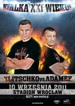 Vitali Klitschko vs. Tomasz Adamek, billed as Walka XXI Wieku!, was a heavyweight bout for the WBC heavyweight championship. The fight took place at the Stadion Miejski in Wrocław, Lower Silesian, Poland on September 10, 2011, and was televised via HBO World Championship Boxing.[1] As a part of a split-site doubleheader, the broadcast also featured the Yuriorkis Gamboa vs. Daniel Ponce de León bout taking place at the Boardwalk Hall in Atlantic City, New Jersey, United States.[2] In Poland, the bout was available on Cyfra+ pay-per-view platform, making it the first PPV fight in Polish television history.[3][4]