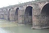 In the second year of the Yuantong (traditional Chinese: 元統, simplified Chinese: 元统, pinyin: Yuán Tǒng ) Era (year 1334) of Yuan Dynasty, the bridge was eventually finished.[1] It was a covered bridge with Buddhism characteristics. It had 50 rooms on the bridge for the statues of a series Buddhism gods (Buddhas), including the Four Heavenly Kings.[1] Its piers were made of stone and remain now. Its upper structures were wooden, with roofs and tiles to prevent raining and snowing. The average height of each pier above then water level was 41 chǐ, according to the historic record; and the bridge deck was 8 chǐ above then water level of the river. The total length of the bridge was 780 chǐ, which shows it was a very large bridge during that time in the world.[1] The watercut design and structure were applied to the piers of the bridge, to minimize the friction of the river's water flow to piers.[2][3]