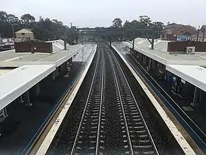 Toongabbie station opened on 26 April 1880.[2] The station was a small, unattended conditional stopping place. The first platform was on the northern side of the track.[3] When the line was duplicated in March 1886, an additional platform was added on the south side of the tracks. A disc on the end of a five-foot pole was held up by intending passengers to stop the train.[3] The station was rebuilt in the 1940s when the Main Western line was quadrupled.[4] In 2018, work was completed on an accessibility upgrade which like its neighbouring stations Pendle Hill and Wentworthville included a new concourse, footbridge and lifts as part of the Station Accessibility Upgrade Program.[5]