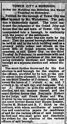 In 1867, Tower decided to start selling the lands, wanting to realize his interest in them. Unfortunately, he could not find a buyer at the time due to the title issues. Deciding instead to establish collieries on the land, in March 1868 he leased 1,503 acres (608 ha) (6 km2) to two independent coal companies. It was a 15-year term, with a rental of $.30 for each ton of coal mined. The companies placed two collieries on the land, the Tower (Later known as East Brookside) and the Brookside. Near the collieries, Tower began to develop a small town, which was named Tower City when first surveyed. Tower laid out the town, and rented lots to settlers. The town was up and running by mid-1872, and immediately suffered a housing shortage. After these initial growing pains, the town grew steadily due to the collieries, and was officially incorporated on December 19, 1892 as a borough of Porter Township, Schuylkill County.