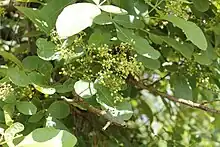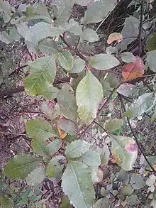 Toxicodendron parviflorum commonly known as small-flowered poison sumac is a much-branched shrub bearing stalked leaves with three leaflets; the end leaflet is larger than the other two. The leaflets are obovate, with rounded tips, tapering bases and irregularly toothed margins. The flowers are tiny, yellowish and fragrant. The fruit is small, round and red when ripe. T. parviflorum is found in the Himalayas, from Kumaun to Bhutan, at altitudes of 700โ1,100 metres (2,300โ3,600 ft).[1]