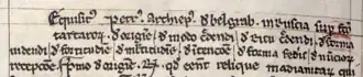About Mongol law, Peter claims that they punished murder, theft, lying and adultery. He reports that they respected treaties, although they always demanded services. They respected ambassadors and diplomatic practice.[24] They resorted to cannibalism only in emergencies out of necessity, and they always cooked human flesh before eating it.[25] They were physically stronger and more robust than westerners. He could not estimate their numbers, but they had been joined by many nations and members of all religions. Their forces were active on three fronts: against Egypt, against the Turks and against the Hungarians and Poles. They intended to bring all their armies together in Syria and their ultimate goal was world conquest. Peter praises their military abilities. They were excellent archers. Even their women were warriors. Their leather armour was impenetrable and their siege engines were excellent. When asked how they crossed bodies of water, Peter answered that they crossed rivers on horseback and were preparing ships in three locations. There is no other evidence that the Mongols had naval capabilities in the 1240s.[24] At the end of the Tractatus, it is revealed that Peter's source for much of his information was "a certain Tartar grandee named Chalaladan whose wife was Chirkan's daughter" and who was living in exile in Russia. There is no other record of a son-in-law of Genghis Khan with a name like this, but not all of his daughters by his several wives are known by name.[20]