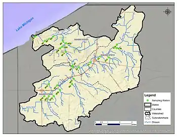 The Trail Creek Watershed, located in northwestern Indiana’s LaPorte County, drains a 59.1 square mile area of mixed land uses into Lake Michigan at Michigan City, IN. The watershed comprises three sub-watersheds: The Main Branch, the East Branch and the West Branch. The Main Branch sub-watershed has the greatest amount of developed land, including commercial, industrial and residential lands. The East Branch and West Branch sub-watersheds are primarily rural in character, including a mix of row crop agriculture, livestock, hayfield, low-density development and natural areas.[7]