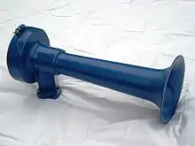 A train horn is an air horn used as an audible warning device on diesel and electric-powered trains. Its primary purpose is to alert persons and animals to an oncoming train, especially when approaching a level crossing. They are often extremely loud, allowing them to be heard from great distances. They are also used for acknowledging signals given by railroad employees, such as during switching operations. For steam locomotives, the equivalent device is a train whistle.