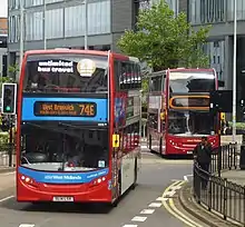 Birmingham has a wide bus network. 84% of public transport use in the West Midlands is by bus.[25] There are approximately 50 operators of registered local bus services in the West Midlands. The largest bus operator in the area is National Express West Midlands, which accounts for over 80% of all journeys. The company changed its name from Travel West Midlands in 2008 as a part of National Express' re-branding. National Express West Midlands operates a large network based on a range of services radiating out of Birmingham City Centre and the route 11 bus service, the longest urban bus service in Europe[26] which chiefly follows the A4040 circular road.
