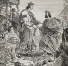 On 7 November 921, the Treaty of Bonn, the text of which calls itself a "pact of friendship" (amicitia), was signed between Charles III of France and Henry I of Germany in a minimalist ceremony aboard a ship in the middle of the Rhine not far from Bonn.[1][2] The use of the river, which was the border between their two kingdoms, as a neutral territory had extensive Carolingian precedents and was also used in classical antiquity and in contemporary Anglo-Saxon England.[3]