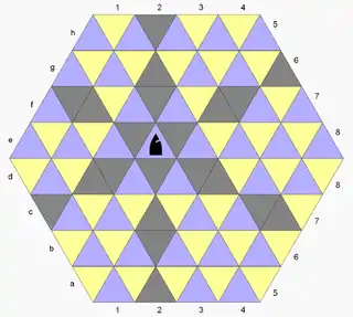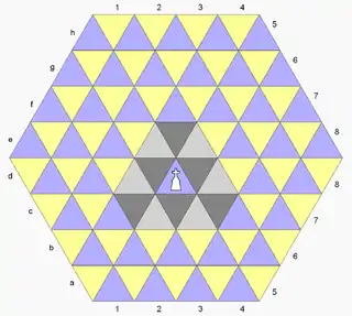 The starting setup is as shown. As in chess, White moves first, and the object is checkmate. Other standard conventions apply as well, including castling, the pawn's initial two-step move, the en passant capture, and promotion at the last rank. The triangular geometry, however, implies special move patterns for the pieces.