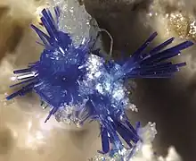 Triazolite is an organic mineral with the chemical structure of NaCu2(N3C2H2)2(NH3)2Cl3·4H2O, and is formed in conjunction with chanabayite, another natural triazolate.[3] Triazolite has only been found in Pabellón de Pica, Chanabaya, Iquique Province, Tarapacá Region, Chile, due to its specific requirements for formation. The first specimens of triazolite were found in what is suspected to be the guano of the guanay cormorant.[4] The guano reacted to chalcopyrite-bearing gabbro, allowing the formation for triazolite to take place. Triazolite was initially grouped together with chanabayite in 2015, and wasn't identified as a separate mineral until 2017.