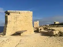 Triq il-Wiesgħa Tower was built in 1659 on the shore east of the Grand Harbour.[3] Its name means "Wide Street", because of the wide stretch of coastline it had to defend.[4] It follows the standard design of the De Redin towers, having a square plan with two floors and a turret on the roof. Triq il-Wiesgħa Tower had Santa Maria delle Grazie Tower in its line of sight to the west, and Żonqor Tower to the east, but these no longer exist as they were both demolished by the British military.