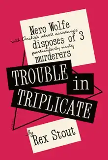 Trouble in Triplicate is a collection of Nero Wolfe mystery novellas by Rex Stout, published by the Viking Press in 1949, and itself collected in the omnibus volume All Aces (Viking 1958). The book contains three stories that first appeared in The American Magazine: