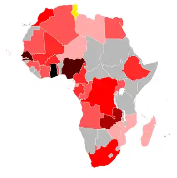 In the 1996 edition, the team reached the final for the second time, but was again defeated by hosts South Africa 0–2.[4] The best participation in this tournament came after 8 years when Tunisia in her country reached the final for the third time and won this time after defeating Morocco in the final 2–1,[5] Francileudo Santos and Ziad Jaziri scored the goals. The last participation was in the 2021 edition in Cameroon, and the team was eliminated in the quarter-finals.