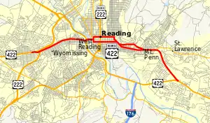 U.S. Route 422 Business (US 422 Bus.) is a 7.29-mile-long (11.73 km) business route of US 422 located in the Reading, Pennsylvania area. The route is one of four auxiliary routes of US 422 in Pennsylvania. Its western terminus is at an interchange with US 222 and US 422 in Wyomissing. Its eastern terminus is at an interchange with US 422 in Reiffton. US 422 Bus. heads east from US 222/US 422 along Penn Avenue, passing through Wyomissing and West Reading. The route has an interchange with the US 422 freeway before it crosses the Schuylkill River into Reading. US 422 Bus. passes through downtown Reading on the one-way pair of Franklin Street eastbound and Washington Street westbound, intersecting the southern terminus of Pennsylvania Route 183 (PA 183) and crossing US 222 Bus. The business route heads into the eastern part of the city southeast on Perkiomen Avenue before following the one-way pair of Perkiomen Avenue eastbound and Mineral Spring Road westbound into Mount Penn. US 422 Bus. continues along Perkiomen Avenue to St. Lawrence, where it intersects the western terminus of PA 562 and turns southeast. The route passes through Reiffton before it merges into eastbound US 422.