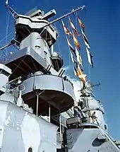 The ship was armed with a main battery of nine 16"/45 caliber Mark 6 guns[lower-alpha 1] in three triple-gun turrets on the centerline, two of which were placed in a superfiring pair forward, with the third aft. The secondary battery consisted of twenty 5-inch /38 caliber dual-purpose guns mounted in twin turrets clustered amidships, five turrets on either side. As designed, the ship was equipped with an anti-aircraft battery of twelve 1.1 in (28 mm) guns and twelve .50-caliber (12.7 mm) M2 Browning machine guns,[lower-alpha 2] but she was completed with a battery of six quadruple 40 mm (1.6 in) Bofors guns in place of the 1.1 in guns and thirty-five 20 mm (0.79 in) Oerlikon autocannon in single mounts instead of the .50-cal. guns.[2][3]