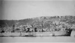 USS Carina (AK-74), anchored after a Japanese suicide boat attack at Okinawa, 4 May 1945.
