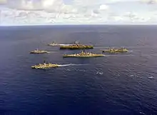 Meyerkord reported to her new homeport, San Diego, California, in July 1974. On 3 January 1975, Meyerkord departed San Diego for her third WESTPAC deployment. After arrival at Subic Bay, the ship answered a distress signal from Gulf Banker, a sinking Panamanian registered merchant ship. Meyerkord rescued 31 ship's crew members and monitored Gulf Banker until it sank to ensure it would not become a hazard to navigation.[4][5] Meyerkord participated in the evacuations of Cambodia and Vietnam as well as fleet towing exercises and a joint exercise with the Royal Thai Navy.[4]