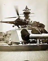 A helicopter lands on a Missouri gun turret during the 1948 Midshipmen's Practice Cruise