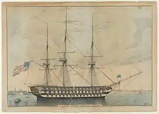 USS North Carolina was a 74-gun ship of the line in the United States Navy. One of the "nine ships to rate not less than 74 guns each" authorized by Congress on 29 April 1816,[1] she was laid down in 1818 by the Philadelphia Navy Yard, launched on 7 September 1820, and fitted out in the Norfolk Navy Yard. Master Commandant Charles W. Morgan was assigned to North Carolina as her first commanding officer on 24 June 1824.