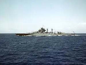 By early July 1944, the ship was ready to begin sea trials in her post-refit condition. She loaded ammunition on 2 July and departed for trials off Port Townsend, Washington, with the evaluations continuing until 12 July, at which point she returned to Puget Sound for repairs. She then steamed south to San Pedro, Los Angeles for a shakedown cruise before departing for Hawaii on 14 September in company with a pair of escorting destroyers. After arriving there on 23 September, she joined Battleship Division 4 (BatDiv 4) and the carrier Hancock, all of which sailed on to Manus in the Admiralty Islands to begin preparations for the upcoming operations in the Philippines. The ships arrived in Seeadler Harbor on 5 October and the following day, West Virginia became the flagship of Rear Admiral Theodore D. Ruddock, the commander of BatDiv 4.[4]