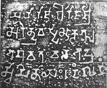 - ↑ The rock inscription came into view when an old banyan tree was uprooted. (Sircar 1971, p. 79) The first report on the artifact was published by R. M. Nath (Sharma 1978, p. 1)