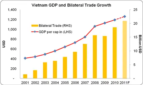 U.S. - Vietnam Trade Relations refer to the bilateral trade relationship between the United States of America (U.S.) and the Socialist Republic of Vietnam (Vietnam) from 1990s to 2012. After more than two decades of no economic relationship since the end of the Vietnam War,[1] the two governments reestablished economic relationship during the 1990s.[2] The bilateral trade between the U.S. and Vietnam grew slowly afterwards, and it has developed rapidly after the signing of the U.S.-Vietnam Bilateral Trade Agreement in December 2001.[3] Total bilateral trade turnover has increased 1200% from $1.5 billion in 2001 to over $20 billion in 2011.[4] The bilateral trade relations further developed after the U.S. granted Vietnam permanent normal trade relations (PNTR) status as part of Vietnam’s accession to the World Trade Organization (WTO) in 2007.[2] The U.S. and Vietnam also came to a Trade and Investment Framework Agreement (TIFA) in 2007.[5] Vietnam was recently the United States' 26th largest goods imports partner with $17.5 billion in 2011,[6] and was the 45th largest goods export market with $3.7 billion in 2010.[5] Vietnam with six other partners are now in the ongoing Trans-Pacific Partnership (TPP) negotiations with the U.S.[7] The growth in bilateral trade has also been accompanied by issues and problems, e.g. anti-dumping cases, worker’s rights, non-market economy, Intellectual Property Rights (IPR) protection and Vietnam’s exchange rate policy.[2]