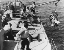 Having located and captured a spent torpedo, it could now be recovered. The early 40' and 42' torpedo retrievers had no ability to bring a weapon on board. Their crews would snare a floating torpedo, tie a line to it, and tow it to a dock or ship where it could be craned out of the water. In the absence of purpose-built torpedo retrievers, a wide variety of small boats performed similarly. Disadvantages of these early vessels included their inability to operate in difficult sea conditions, to stay on station overnight, to navigate on their own, and to recover more than one torpedo per trip. These early retrievers had no radios. They would communicate by raising a "bravo" signal flag to indicate they were recovering a torpedo.[5] Beginning with the 63' boats and continuing to the present day, all U.S. Navy torpedo retrievers have an inclined aft deck or ramp equipped with rollers that allow torpedoes to be winched aboard directly from the sea.[10] These larger vessels could recover multiple torpedoes before off-loading to a shore facility or ship.