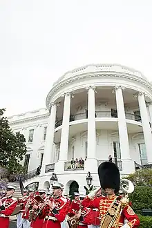 • Foreign heads of state and chiefs of government arriving at the White House are welcomed with the fanfare "Call to Statesmanship". At the conclusion of a state arrival ceremony, the President returns to the White Housegenerally entering either via the Blue Room or the Diplomatic Reception Roomto the fanfare "Presidential Processional".
