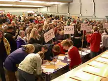 A 2008 Washington state Democratic caucus held in the school lunchroom of Eckstein Middle School in Seattle. In some states like Washington, voters attend local meetings run by the parties instead of polling places to cast their selections.