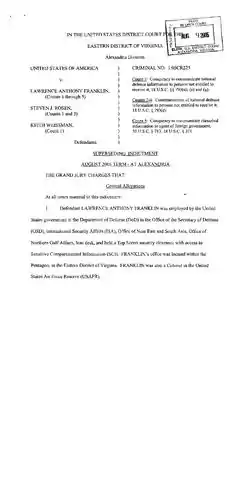 - 1 2 3 4 5 6 US vs Franklin, Rosen, & Weissman, 2005, US District Court for the Eastern District of Virginia, Grand Jury Indictment.