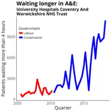 Four-hour target in the emergency department quarterly figures from NHS England Data from https://www.england.nhs.uk/statistics/statistical-work-areas/ae-waiting-times-and-activity/