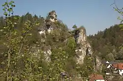 The ruins of Upper Tüchersfeld Castle (German: Burgstall Oberntüchersfeld) are all that remains of a high medieval castle that once rose high above the valley of the Püttlach in the church village of Tüchersfeld in Germany's Franconian Switzerland. It was built on a spur of the Mittelberg and was one of two castles in the village, the other being the Lower Tüchersfeld Castle.