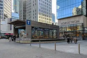 : located at the southwest corner of the intersection of Granville Street and West Georgia Street. Elevator access at this entrance is located south of the main entrance building.[6] - Concourse level entrances: have a direct connection to Pacific Centre and Vancouver Centre shopping malls.