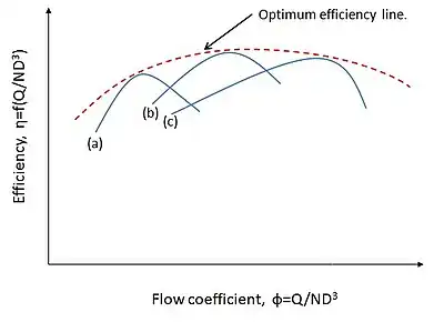 If all fluid velocities at corresponding points within the turbomachine are in the same direction and proportional to the blade speed, then the operating condition of a turbomachine at two different rotational speeds will be dynamically similar. If two points, each on dissimilar head-flow characteristics curve, represent similar dynamic operation of the turbo machine, then the non-dimensional variables (ignoring Reynolds number effects) will have same values.