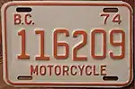 1974-78 | Orange on white plate, "B.C." in top left corner; "MOTORCYCLE" screened at bottom centre. | none | 123456 | ||